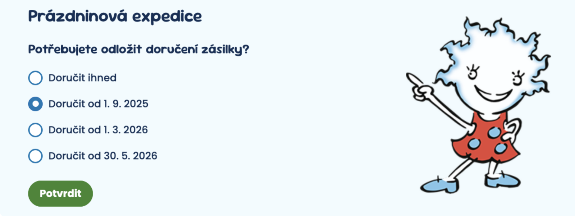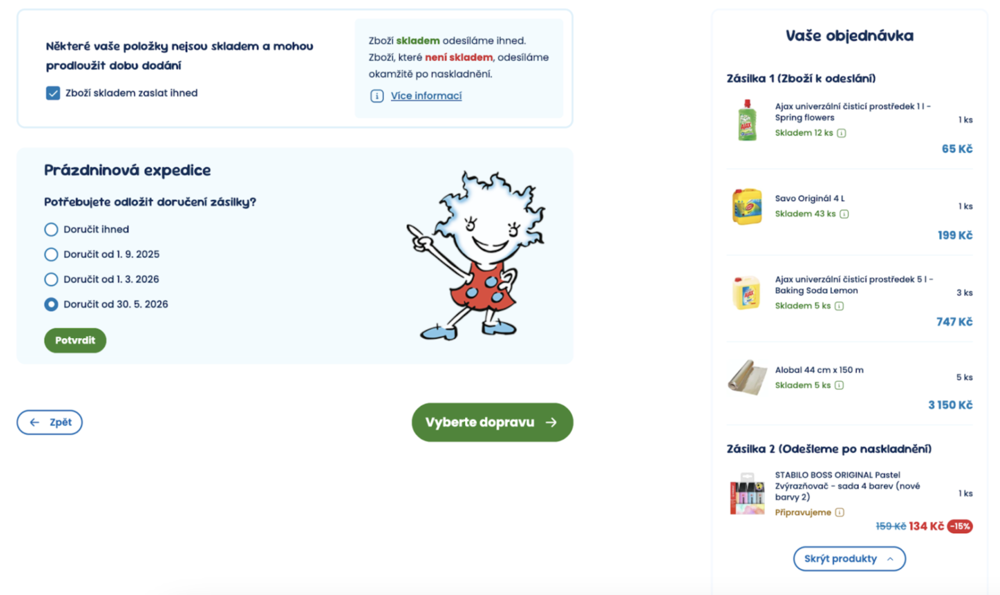 Při objednávce lze nastavit budoucí datum doručení, takže nákup proběhne nyní, ale expedice je naplánovaná na později. Hodí se to pro instituce, které nemají zajištěný prázdninový provoz a eliminuje se tak riziko doručování zásilek v době, kdy na škole není přítomen žádný personál. Zákazník má jistotu rezervace zboží a termín doručení pod kontrolou.
